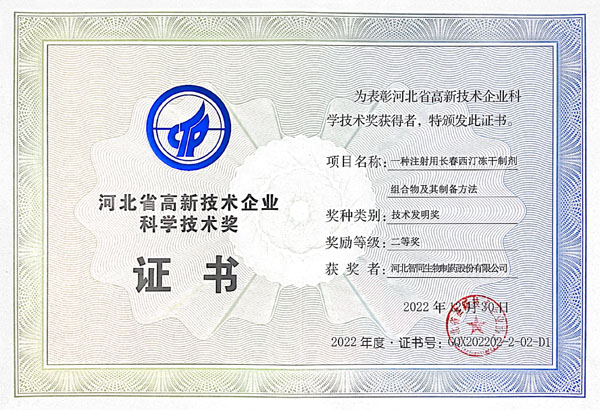 获得河北省医药行业协会2020-2021年度河北省医药行业协会科技型中小企业创新奖