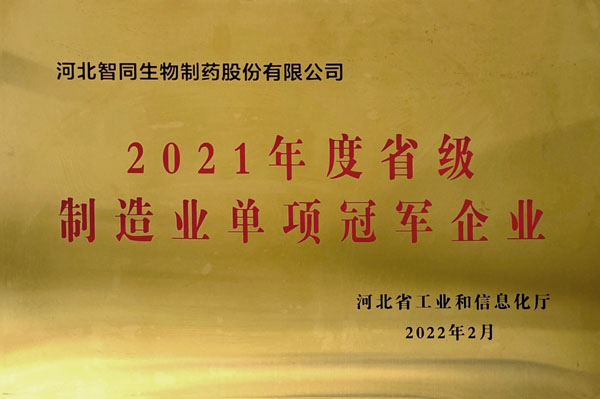 获得河北省工业和信息化厅“2021年度省级制造业单项冠军企业”称号